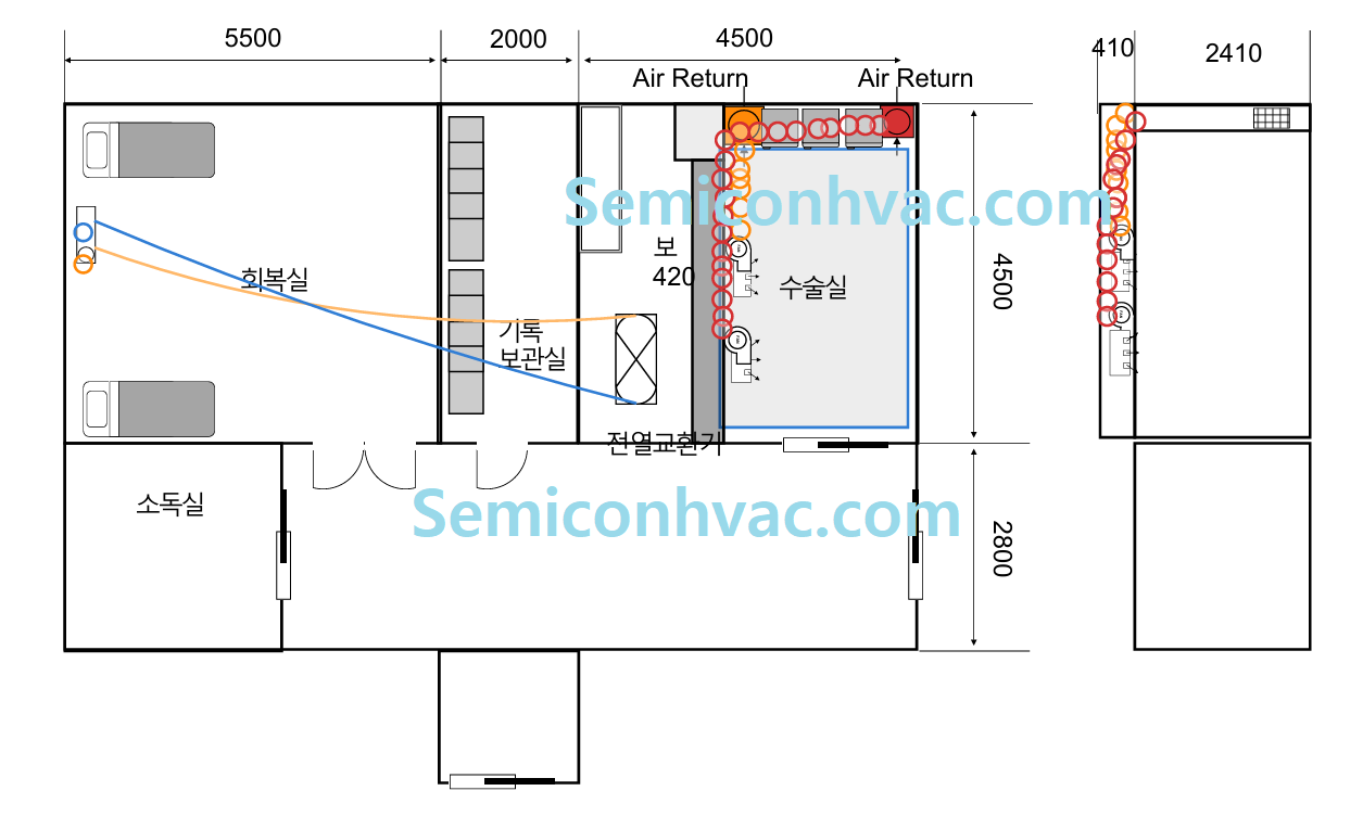 법규 준수: 의료법 시행규칙에 따라 HEPA 필터(H14 이상)와 층류(Laminar Flow) 환기 시스템을 적용합니다. 중위험 수술의 경우 시간당 15회 이상의 공기 순환, 고위험수술의 경우 시간당 20회 이상과 3회 이상의 외부 공기 유입 기준을 준수합니다.